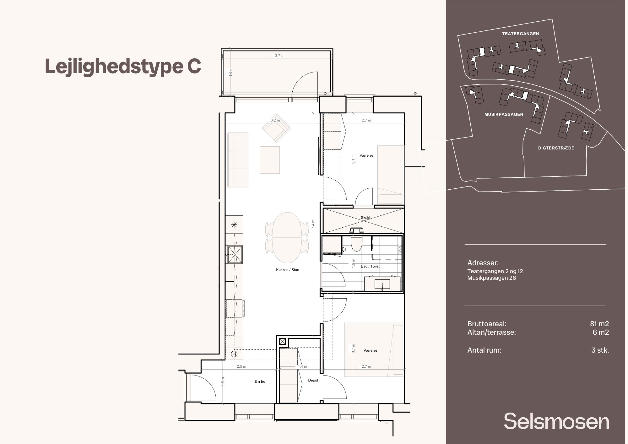 Bemærk at billederne kan være af en tilsvarende boligtype, hvorfor vi henviser til plantegningen og altid opfordrer til du oplever lejemålene ved selvsyn. Materialerne er dog de samme i alle enheder, med små variationer.