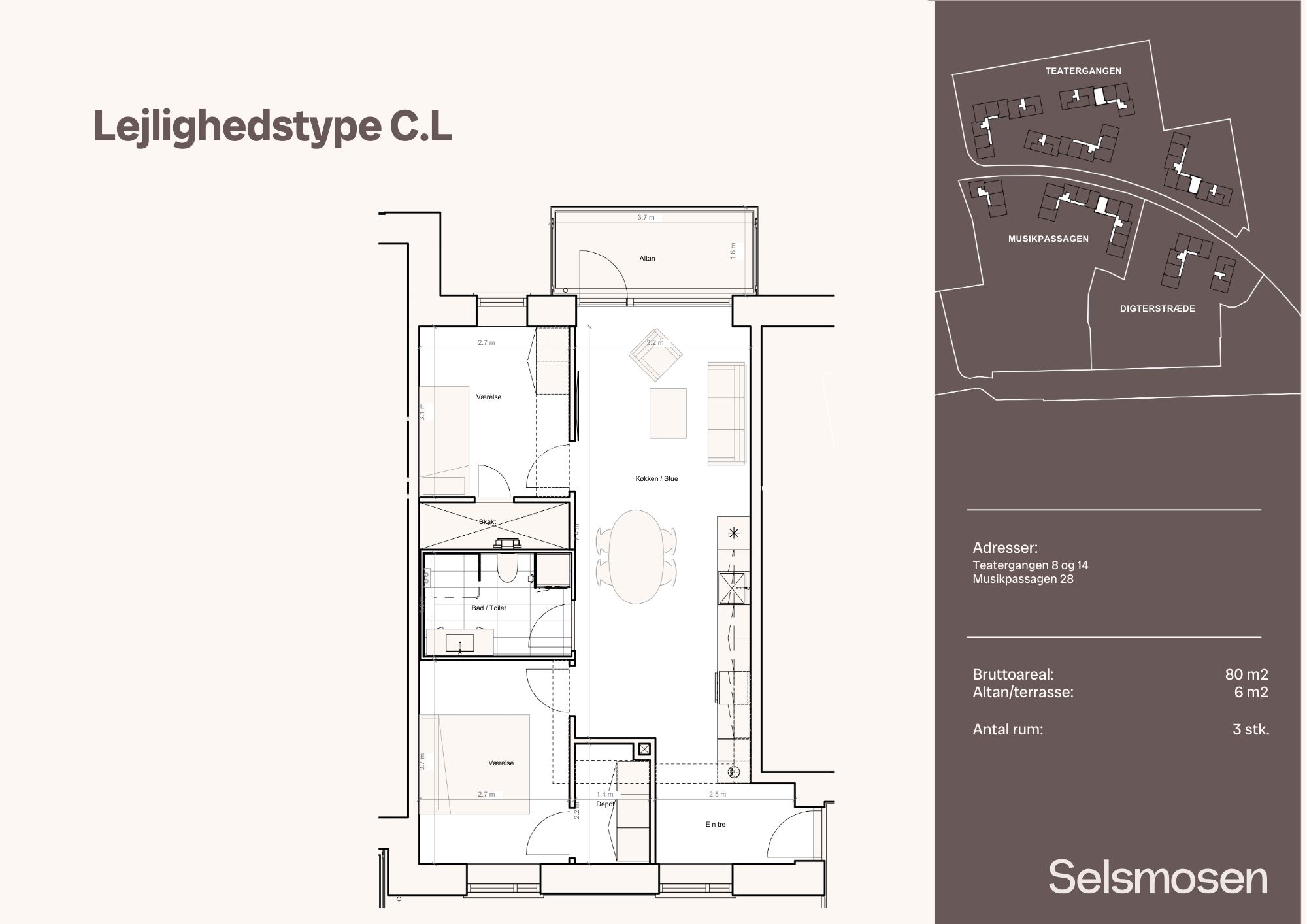 Bemærk at billederne kan være af en tilsvarende boligtype, hvorfor vi henviser til plantegningen og altid opfordrer til du oplever lejemålene ved selvsyn. Materialerne er dog de samme i alle enheder, med små variationer.